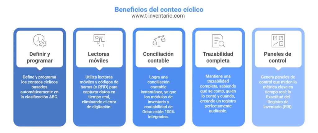 - El Conteo Cíclico: Es un proceso continuo, integrado en la operación diaria. En lugar de contar todo de una vez, se cuentan pequeños grupos de artículos específicos de forma rotativa (diaria, semanal, mensual). No detiene la operación y, lo más importante, permite identificar y corregir errores casi en tiempo real.