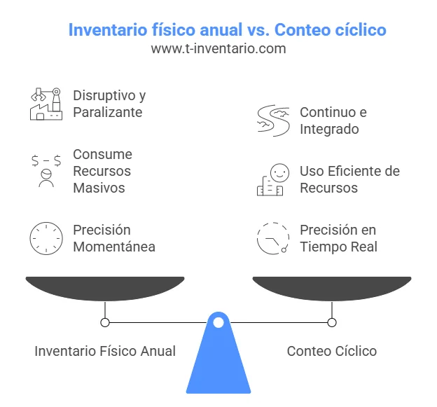 - El Inventario Físico Anual: Es un evento único, masivo y altamente disruptivo. Paraliza la operación, consume una enorme cantidad de recursos humanos y es propenso a errores por la fatiga y la prisa. Su precisión, aunque alta en ese instante, se degrada desde el momento en que reabres la bodega.